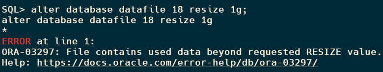When Resize wasn’t able to reduce the file size to 1GB, shrink tablespace has gained an impressive reduction on the Bigfile tablespace.