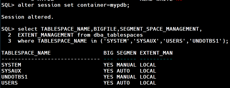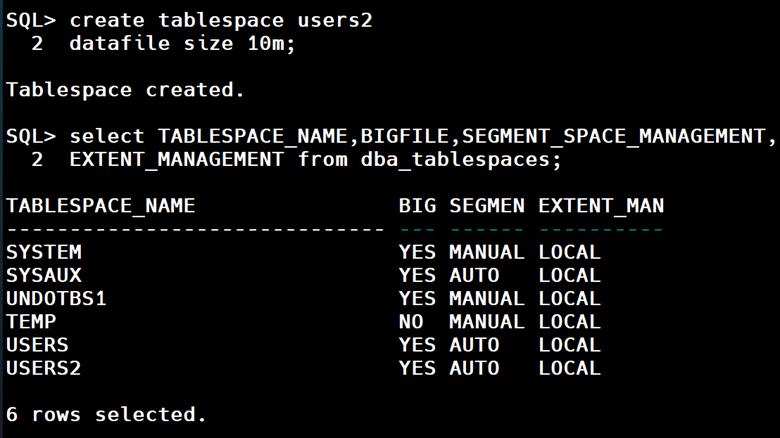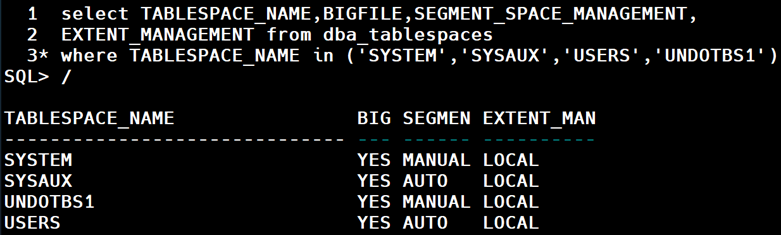 It should be noted that the expected Bigfile tablespace are to be created as locally managed with Automatic Segment Space Management (ASSM) , except for system, undo and temporary tablespaces created with Manual Segment Space Management.