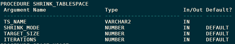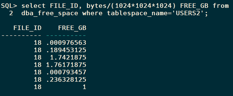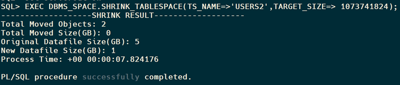 SQL> EXEC DBMS_SPACE.SHRINK_TABLESPACE(TS_NAME=>’USERS2′,TARGET_SIZE=> 1073741824)