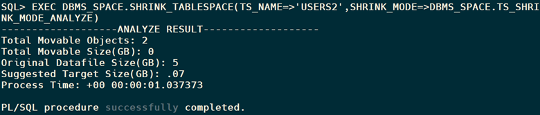 SQL> EXEC DBMS_SPACE.SHRINK_TABLESPACE(TS_NAME=>’USERS2′,SHRINK_MODE=>DBMS_SPACE.TS_SHRINK_MODE_ANALYZE)