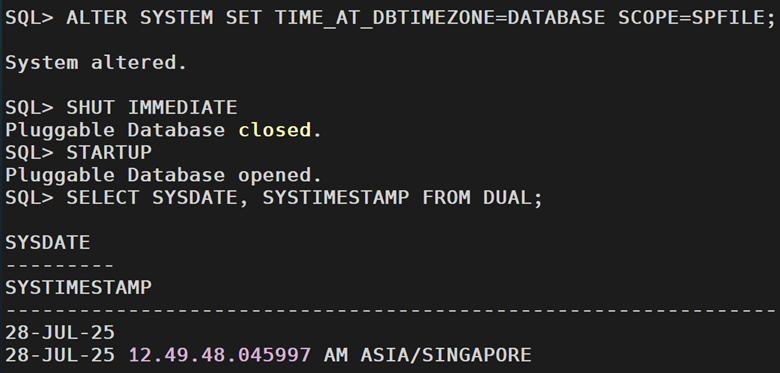 As expected, the returned values are based on the PDB timezone setting for functions such as SYSDATE and SYSTIMESTAMP